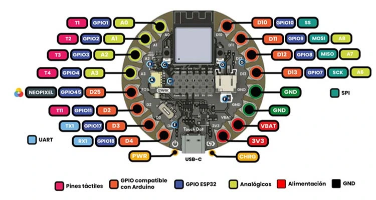 A diferencia de la tarjeta de desarrollo Lilypad, la tarjeta UNIT TouchDot toma lo bueno de Arduino y lo traslada a MCU ESP32-S3 para que tengamos las bondades de poder realizar proyectos wearables y proyectos interactivos por medio de los pines touch.