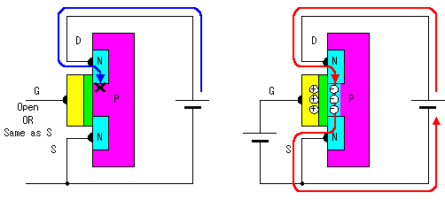 Este es otro tipo de transistor perteneciente a la familia FET (Transistor de efecto de campo), el cual refiere a la forma en que funciona y es que para que conduzca corriente se debe aplicar una tensión entre las terminales Gate y Source para que formen (MOSFET del tipo enriquecimiento) un canal de conducción entre las terminales Drain a Source por medio de este campo eléctrico.