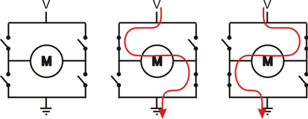 Obsérvese el cambio en las direcciones de corriente al mover el interruptor que provocan el cambio en el giro del motor.