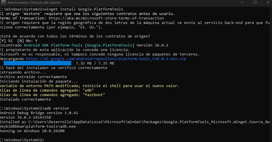 Para verificar que la herramienta esté instalada, ejecutaremos “adb versión”: