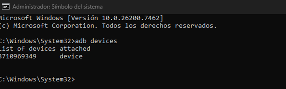 Con la herramienta instalada, conectaremos la UNO Q, a través del USB-C®. Abriremos el símbolo del sistema como administrador y correremos el comando “adb devices”, deberías aparecer una lista de los dispositivos conectados, hay que tener en cuenta que el dispositivo puede tardar hasta un minuto en aparecer.