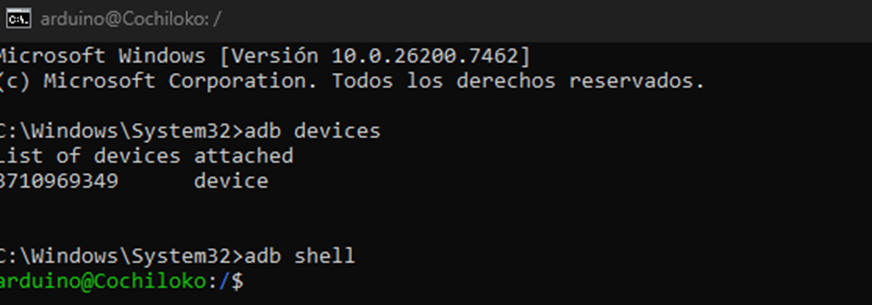 Correremos el comando “adb shell”, esto nos permitirá entrar al sistema Debian de nuestra placa: