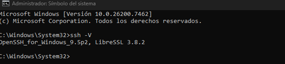 Las versiones posteriores de Windows (10+) incluyen SSH, sin necesidad de instalar herramientas adicionales. Para verificar que las herramientas estén instaladas, abramos una terminal y ejecutaremos el comando “ssh -V”: