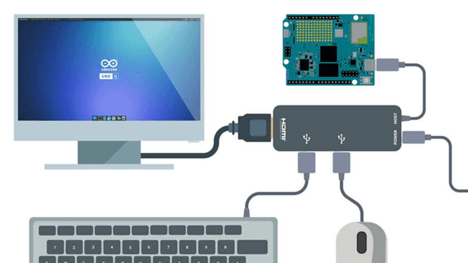 El modo de SBC convierte tu UNO Q en una computadora de escritorio independiente con interfaz gráfica de usuario. Para usar este modo, necesitarás un adaptador USB-C® con suministro de energía externo, una pantalla HDMI y un teclado y ratón USB.