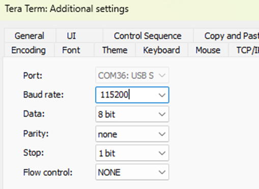 Si usas directamente un convertidor USB a TTL de 1.8 V, puedes seguir el diagrama de la foto 21 en caso contrario deberás usar un convertidor lógico, para disminuir el voltaje. La configuración del puerto COM será de 11,5200 bps, para ello conectaremos el convertidor USB al PC, abriremos Tera Term, y se mostrará la siguiente ventana: