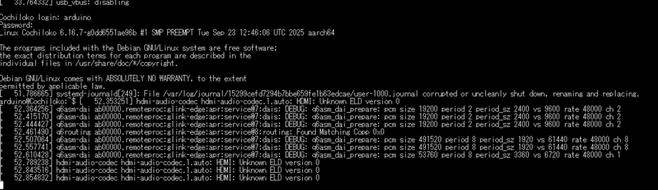 Con el sistema Debian cargado vamos a ingresar a este, para ello presionamos la tecla “Enter”, y nos saldrá una ventana con el nombre de la placa pidiendo el usuario, que en todos los casos es “arduino”, y posterior a eso pedirá la contraseña que hemos configurado, si hacemos los pasos de forma correcta, tendremos este mensaje de ingreso: