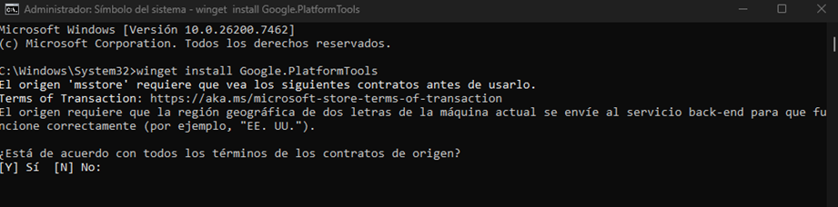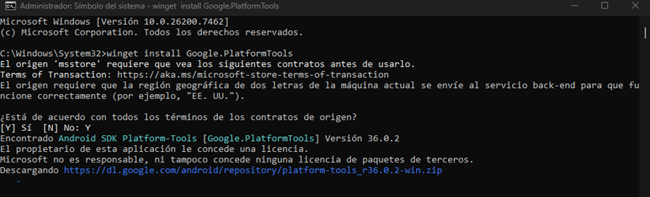 Una vez lo corramos nos pedirá que aceptemos los contratos, para ello solo escribe la letra “Y”, comenzará la descarga de la herramienta: