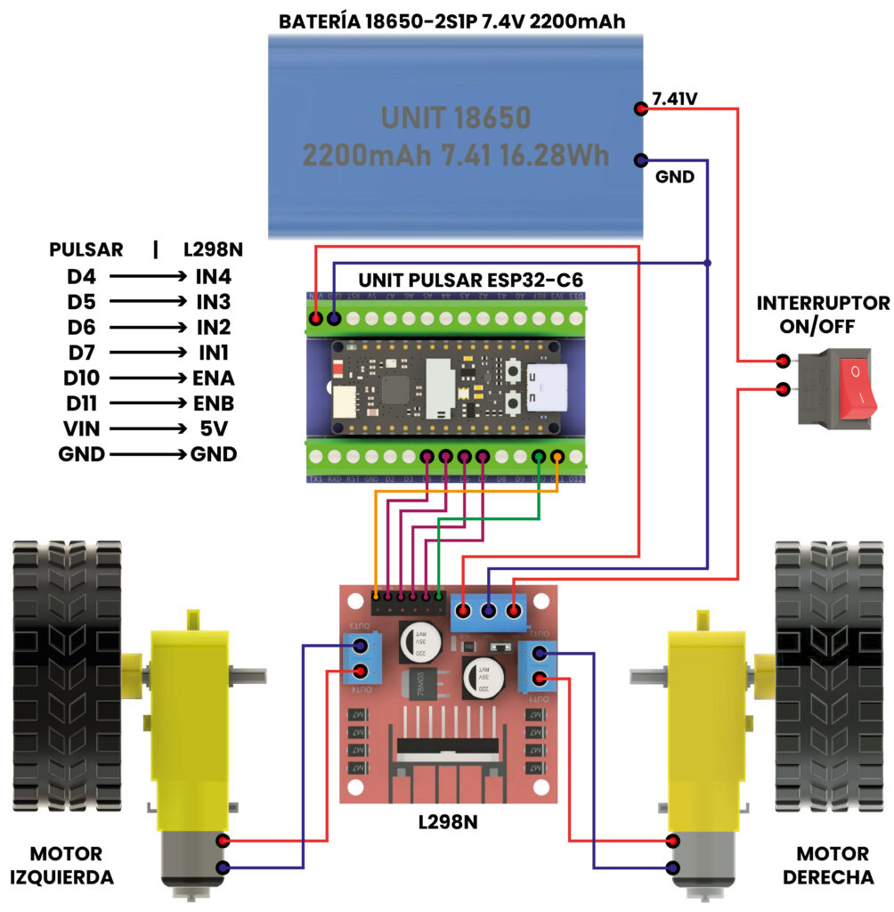 A continuación se muestra el diagrama de conexiones del carrito utilizando la UNIT Pulsar ESP32-C6, el driver L298N y la batería 18650 en configuración 2S (7.4V). Este esquema te permitirá cablear correctamente los motores, el driver y la alimentación para que el carrito funcione.