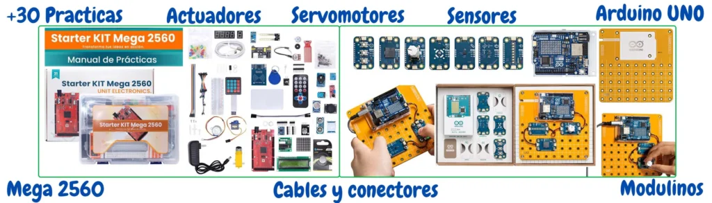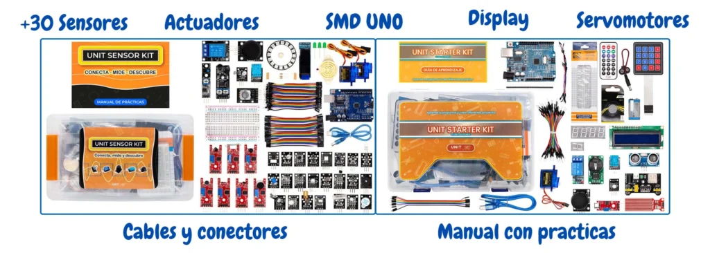 Todos ellos contienen componentes como la protoboard, los conectores y los LEDs facilitan la construcción y prueba de circuitos iniciales, mientras que los diversos sensores enseñan a interactuar con el entorno midiendo variables como temperatura, luz o movimiento.