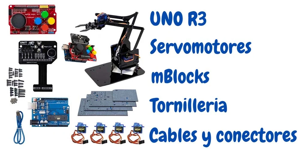 Ideal para comprender y aplicar conceptos mecánicos como la articulación, el torque y la trayectoria, así como de programación para coordinar sus servomotores. Con sus cuatro articulaciones (base, hombro, codo y muñeca), es ideal para desarrollar aplicaciones prácticas como pick-and-place (recoger y colocar objetos), operaciones de clasificación y ordenamiento, dibujo o escritura básica, y como una plataforma inicial para experimentar con automatización industrial a pequeña escala o robótica colaborativa.
