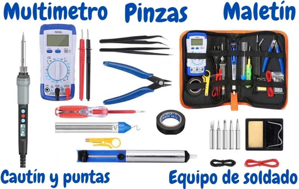 Herramientas esenciales como el succionado de soldadura, las pinzas de diversos tamaños y la cinta aislante complementan el conjunto, facilitando el trabajo de precisión, la extracción de componentes, la sujeción de piezas pequeñas y la protección de conexiones.
